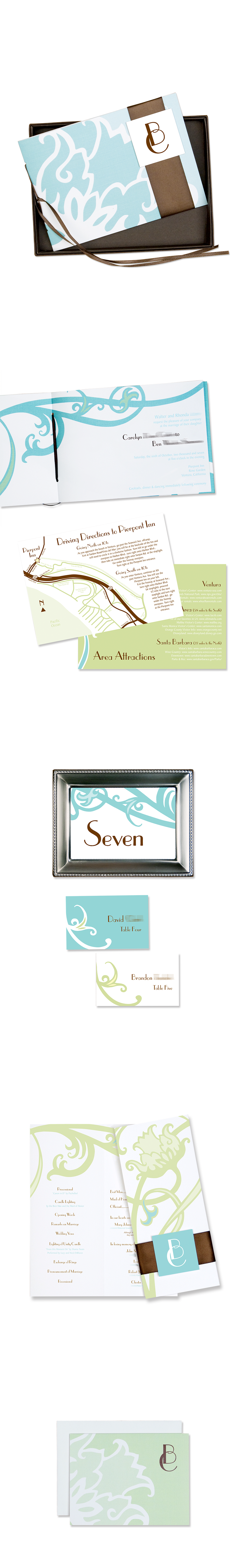 Vintage floral with contemporary feel for a wedding. Boxed invitation, RSVP card, rehearsal invitation, custom drawn venue map, table numbers, place cards, program and thank you notes.